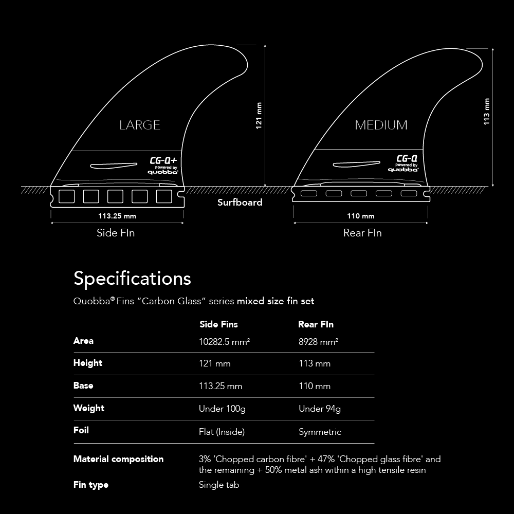 Rear fin (Medium): Height: 113 mm – Length: 152 mm – Base: 110mm – Weight: 100g – Foil: Symmetric
