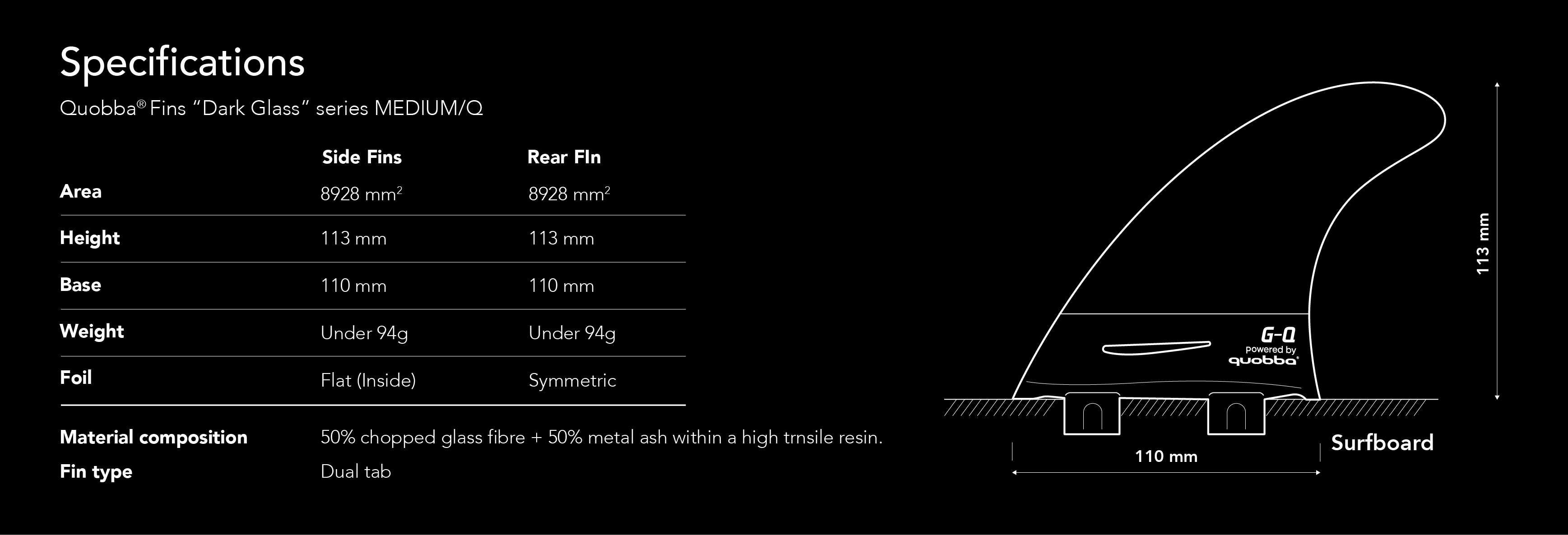 Rear fin: Height: 113mm – Length: 152mm – Base: 110mm – Weight: 96g – Foil: Symmetric