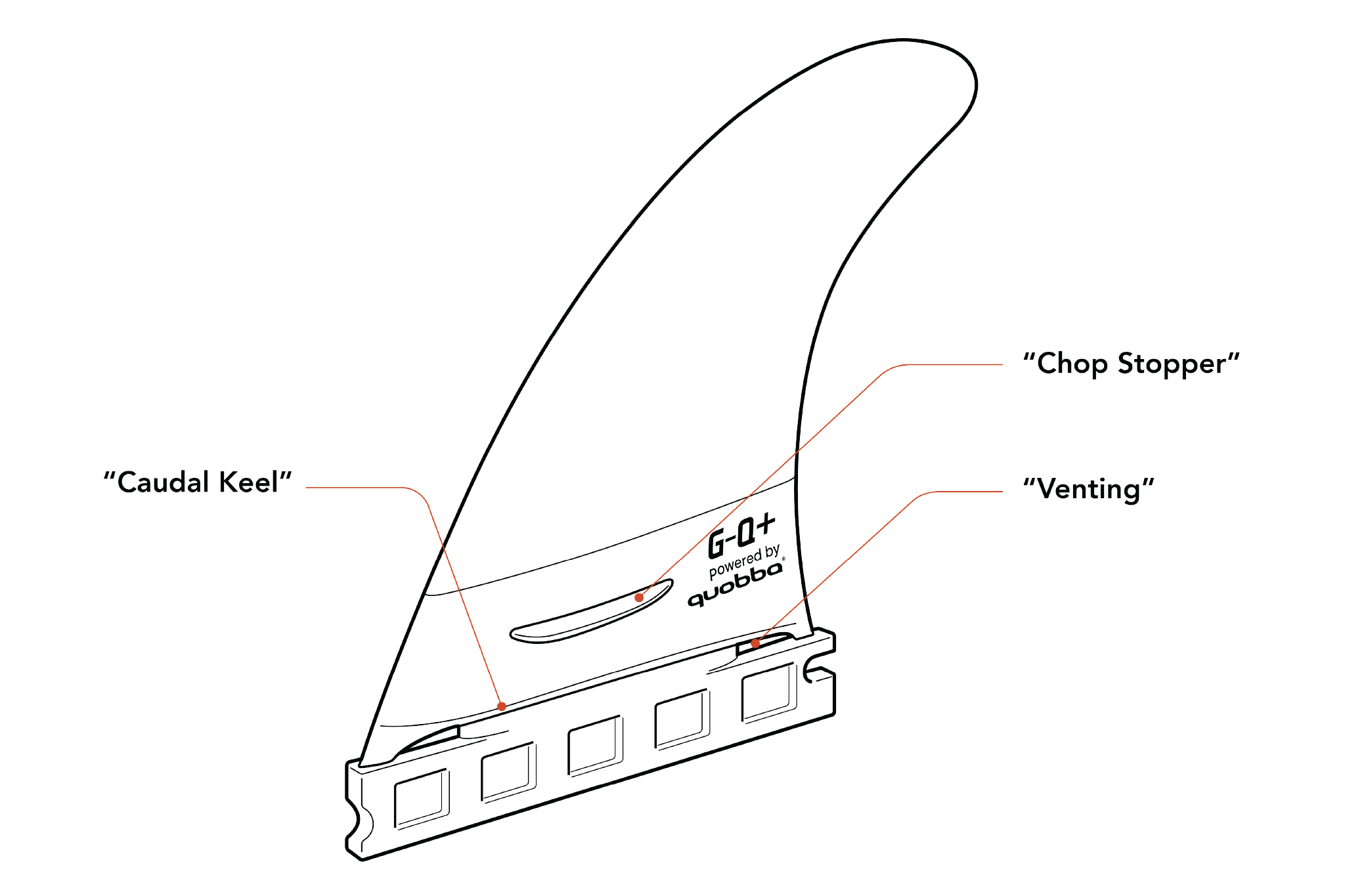 By shaping and ‘ordering’ the water flowing around the fin base, the Quobba fin system markedly reduces trailing turbulence drag, thereby increasing hold and speed in comparison to standard fin designs.