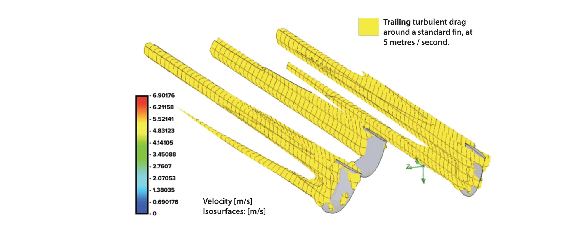 It clearly shows that most of the trailing turbulent drag (coloured yellow) is around and behind the base of all standard fins.